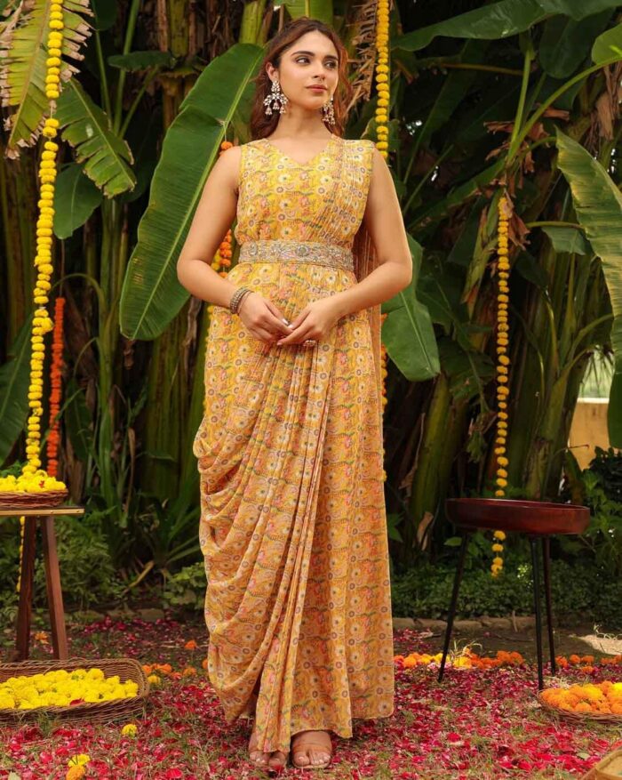Women Floral Print Pre-Stitched Saree with Contrast Border